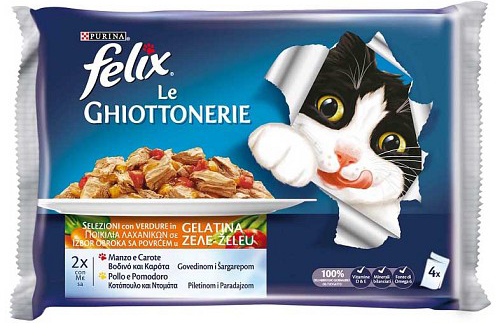 Πλήρης υγρή τροφή σε πολυσυσκευασία με βοδινό & καρότα, κοτόπουλο & ντομάτα σε ζελέ για την ενήλικη γατούλα σας. Πρόκειται για ένα νόστιμο γεύμα με τέτοια όψη και μυρωδιά κρέατος, που μοιάζει σαν το φαγητό που έχετε μαγειρέψει εσείς. Είναι ειδικά παρασκευασμένη με αληθινά, τρυφερά κομμάτια κρέατος σε ζουμερό ζελέ, έτσι ώστε η μικρή μας φίλη να βρίσκει ακαταμάχητο κάθε γεύμα της! Είναι πηγή των απαραίτητων λιπαρών οξέων Ωμέγα 6, ενώ έχει τον σωστό συνδυασμό ισορροπημένων ανόργανων αλάτων και βιταμινών, έτσι ώστε να ικανοποιεί το 100% των καθημερινών αναγκών της γατούλας σας.